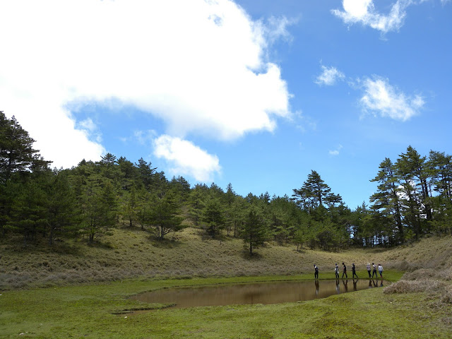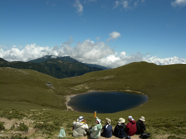 霧中隱現的大水窟池,從南大水窟山上回望,有紅色小山屋的陪伴,